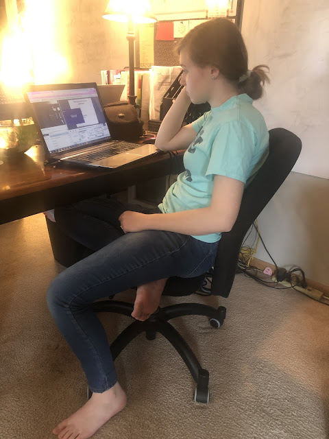 9:31 am ~ They're finally in the school room and working on math. Doing math first is a requirement at our house when everyone is fresh in the morning. Blossom1 does all college work now, so she independently manages her work load and assignments based on their due dates. The rest of them choose what to work on after math and move from subject to subject until they get stuck. Today, Blossom3 is stuck on stem and leaf plots. Though I think they're annoying, I help her understand before I move on to answer Blossom4's question.